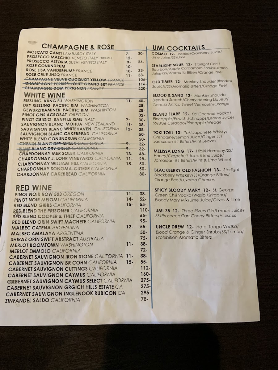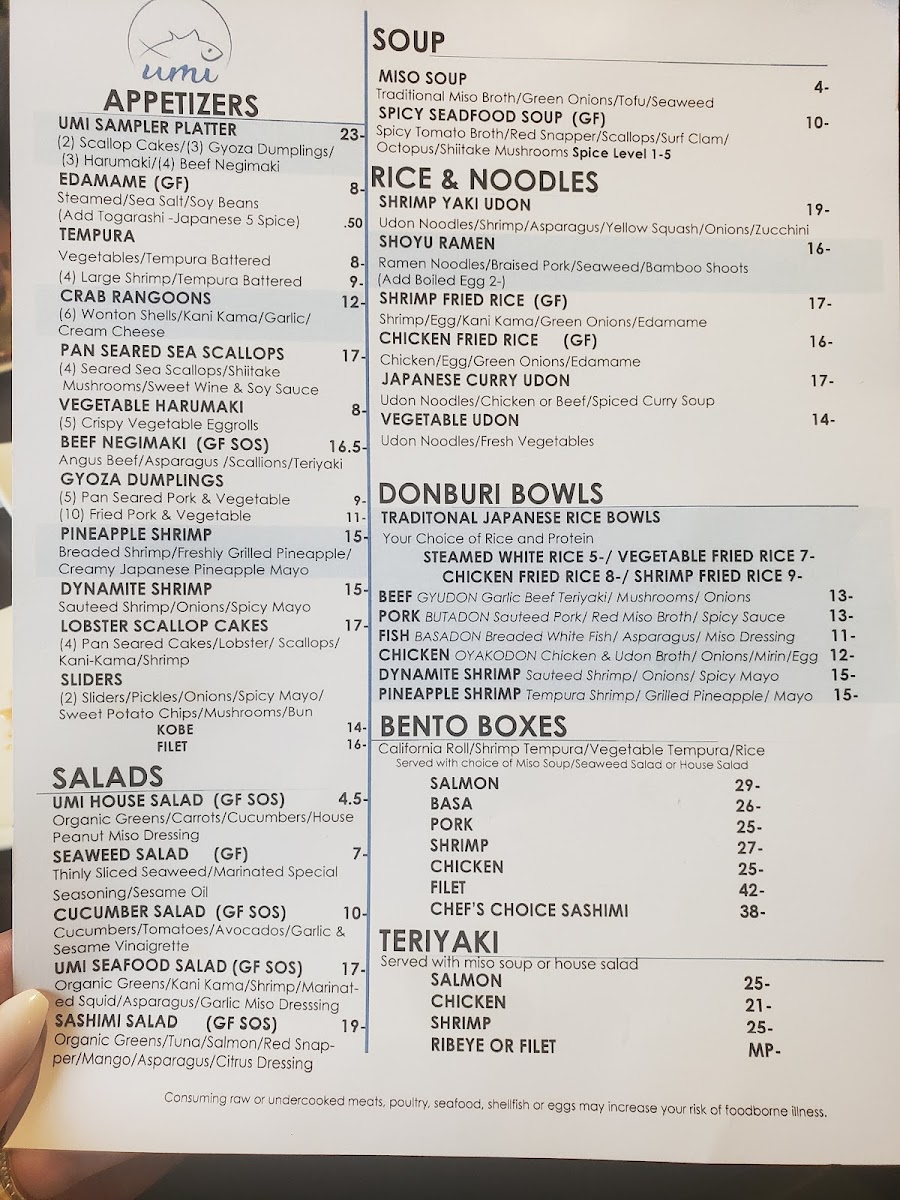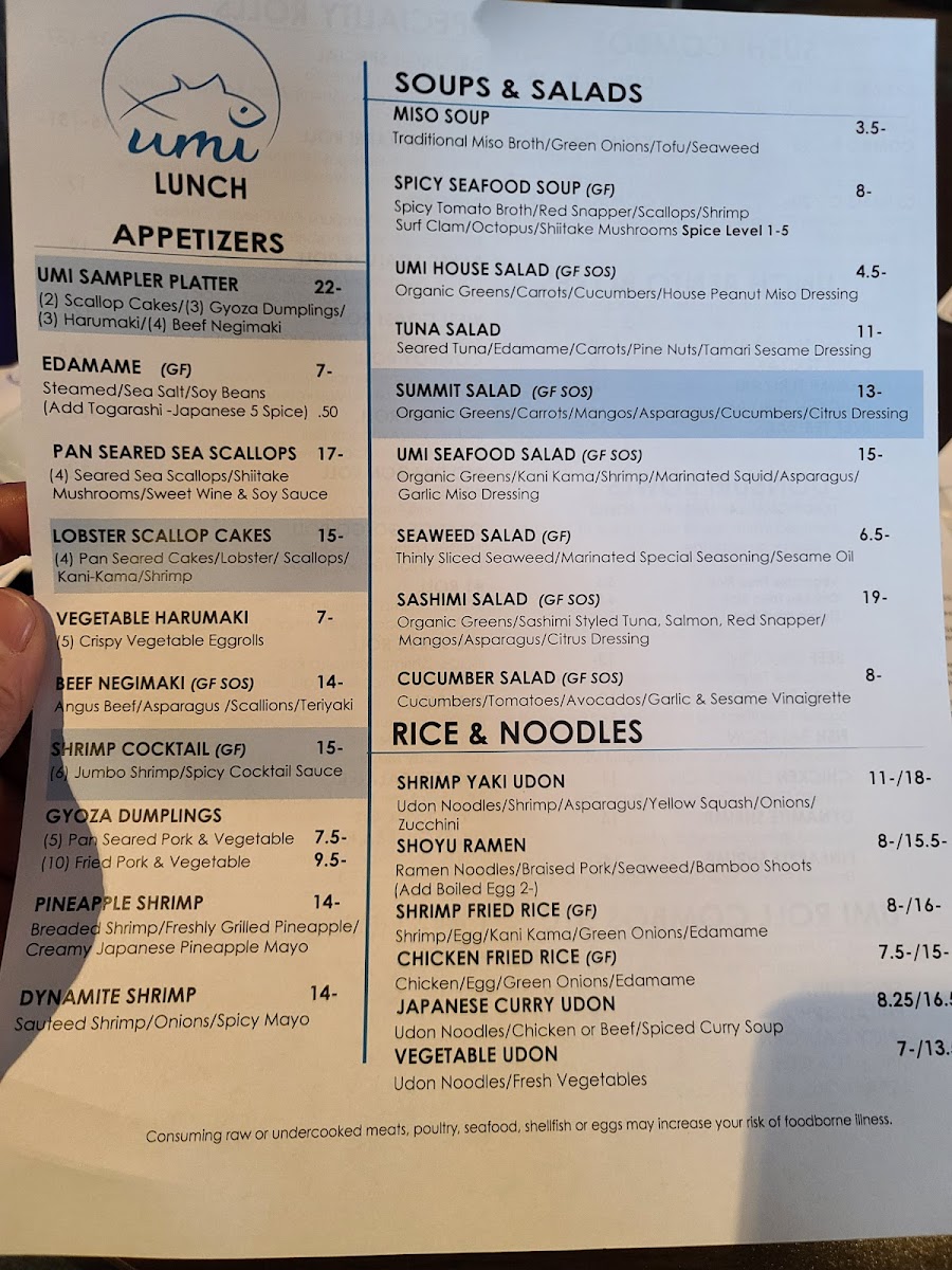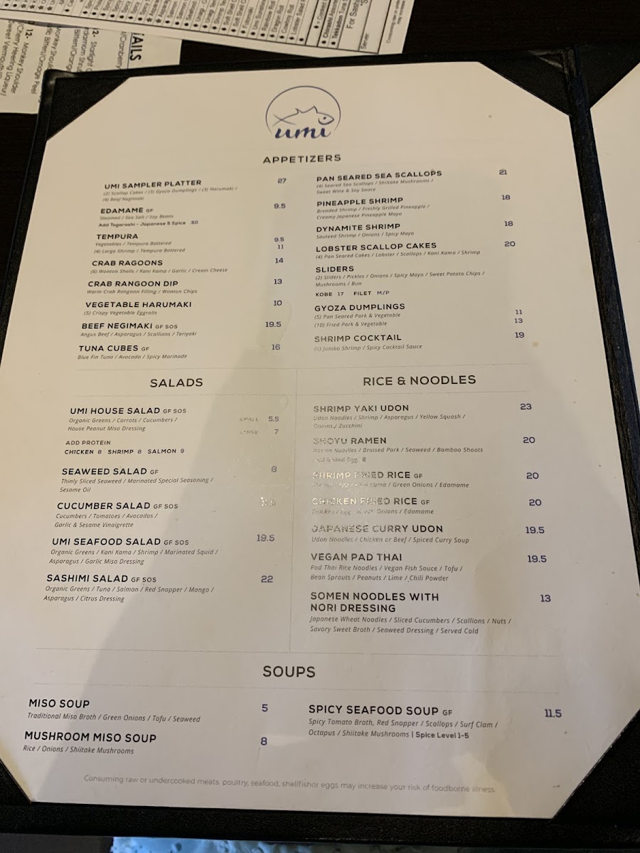 Finally, no meal at Umi would be complete without indulging in their Rice & Noodles offerings. Dishes like Shrimp Yaki Udon, Japanese Curry Udon, and Shrimp Fried Rice provide the perfect balance of flavor and comfort. The Shoyu Ramen and Vegetable Lo Mein round out the selection, offering something for every palate.