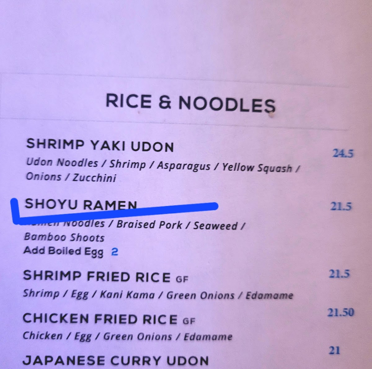 Ramen noodles, braised pork, seaweed, bamboo shoots. Add boiled egg for an additional charge.